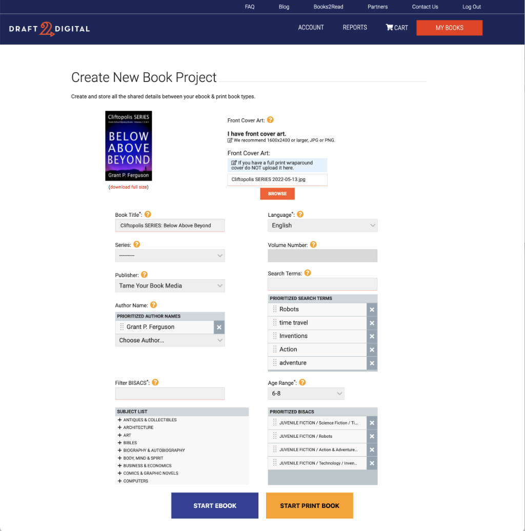 Also, for print, Draft2Digital will auto-generate a wraparound cover based on your ebook art (aka front cover art) and they provide some basic customization options like spine text and back cover text editing.